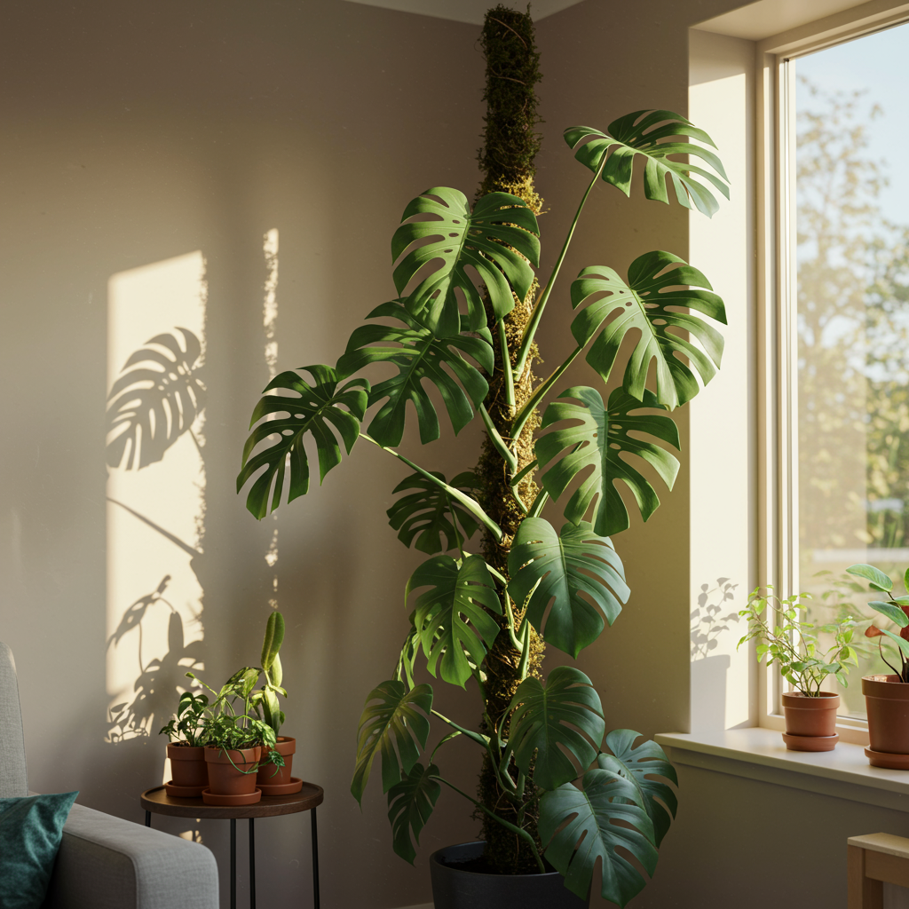 Monsteras love to climb, so giving them a moss pole will encourage larger, more fenestrated (split) leaves. They enjoy bright, indirect light but can tolerate lower light levels, although their growth might be slower.