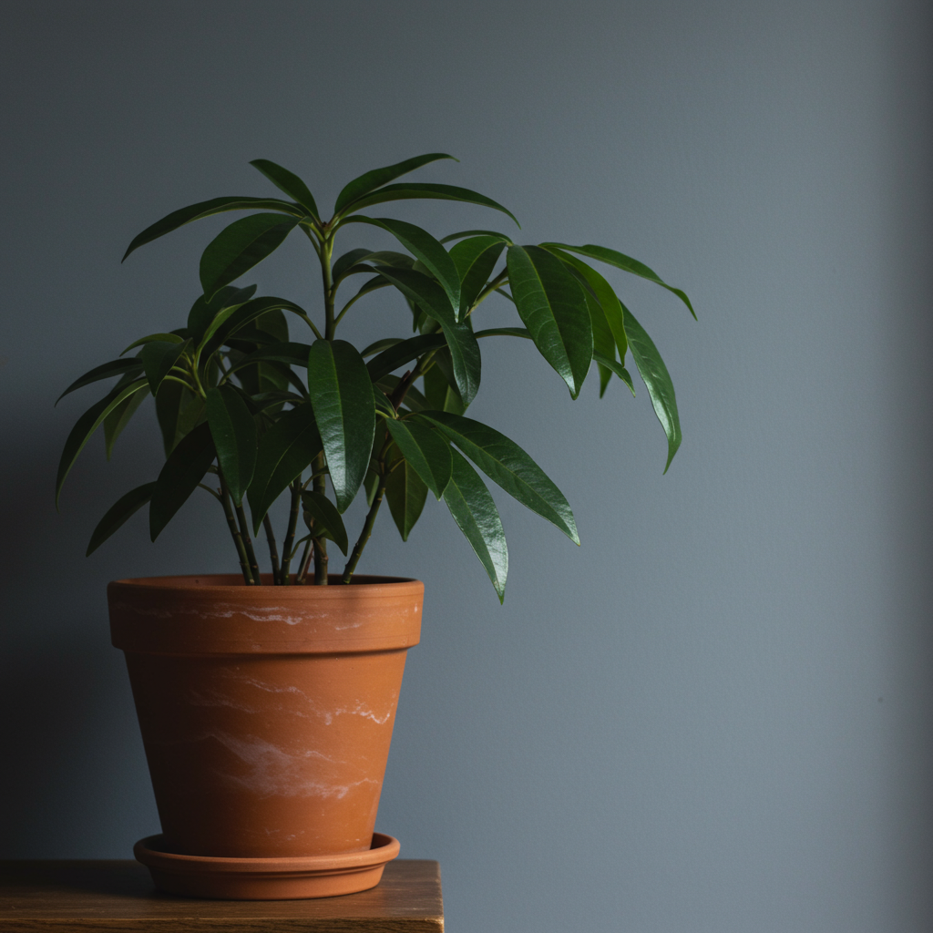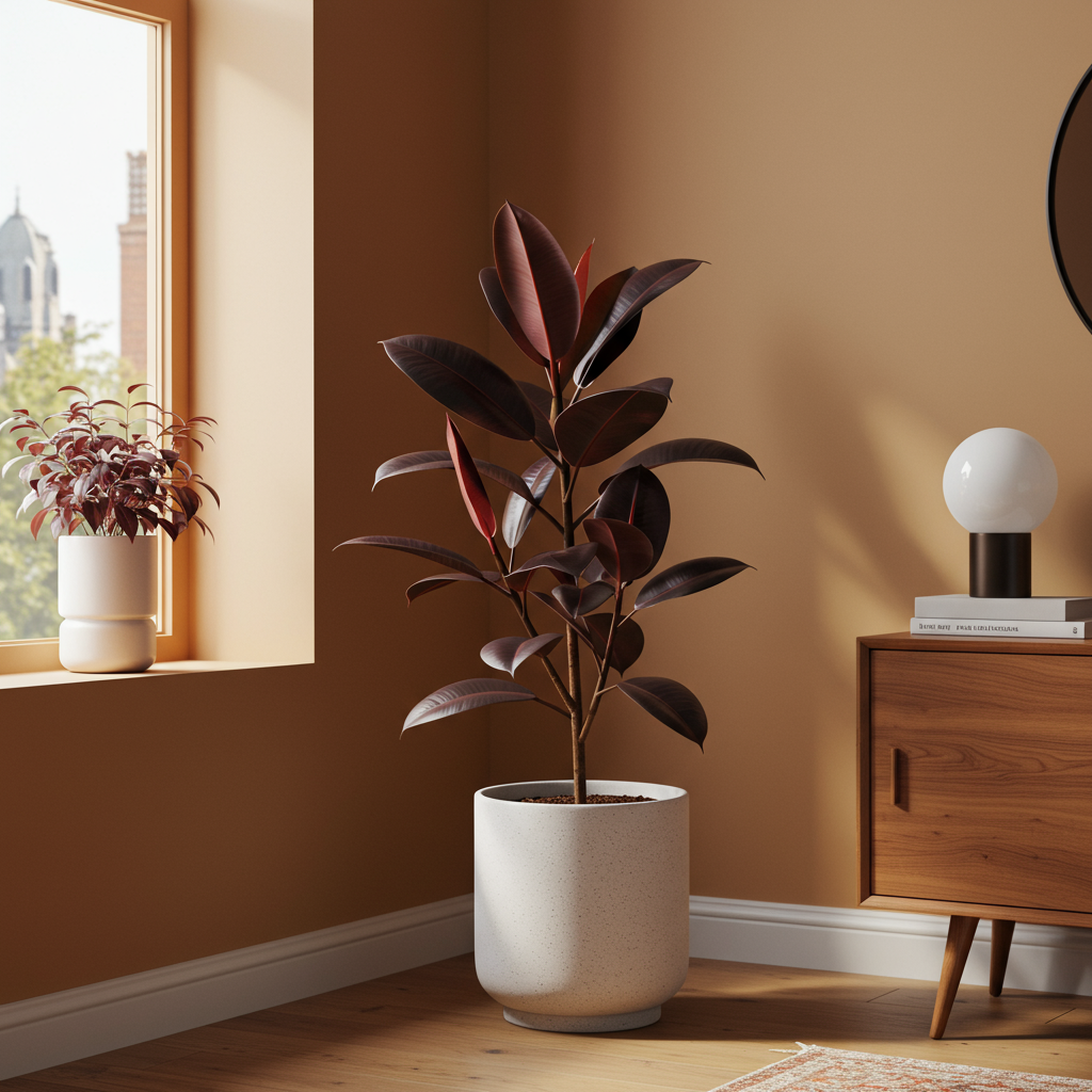The Rubber Plant (Ficus elastica) is a handsome and robust plant. Its large, glossy leaves can range from a deep, moody burgundy to a variegated pink and cream. It has a strong, upright growth habit that adds vertical interest.