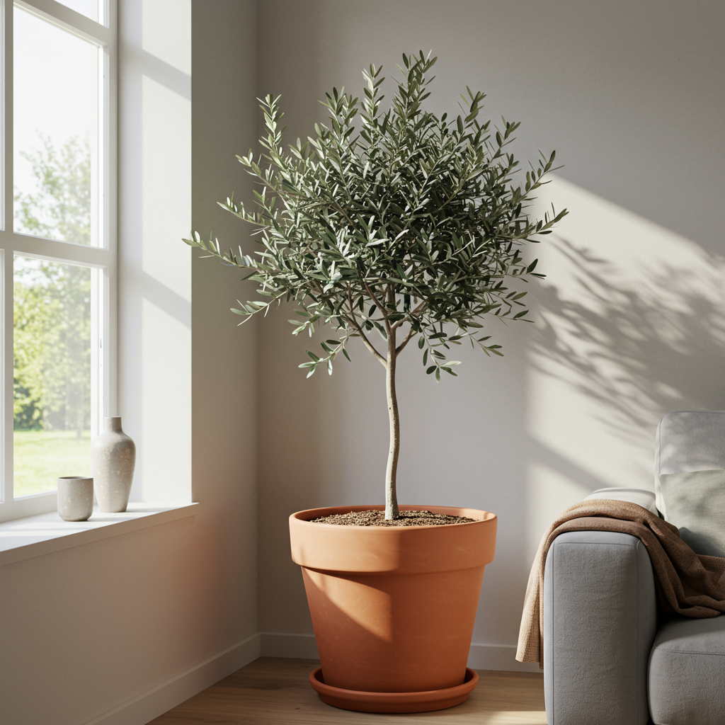 Olive trees need a ton of direct sunlight—at least six hours a day. Place them right next to your sunniest window. They also require well-draining soil and don’t like to have “wet feet.”